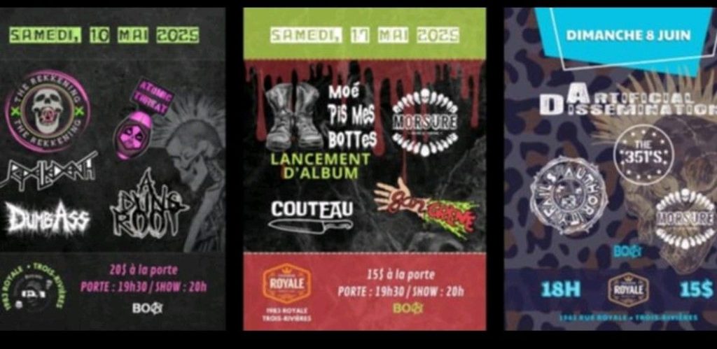 Une autre belle soirée signée Ben Ouellette avec la Production BOA, et je vous laisse quelques affiches des prochains spectacles de la production et des groupes de ce soir. Comme un Phoenix, le punk semble renaître à Trois-Rivières. On vous attend encore plus nombreux pour les prochains spectacles. Si on ‘’ask a punk’’ ou se trouve le prochain spectacle du genre, vous allez probablement le diriger vers la Taverne Royale!