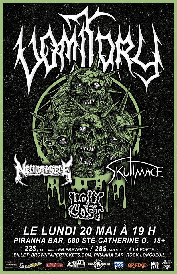 Voici les photos prises par France Hatin lors du spectacle de Vomitory présenté par Dungeon Works Productions au Piranha Bar de Montréal le 20 mai 2019 et qui mettait également à l’affiche Necrosphere, Skullmace et Holy Cost.