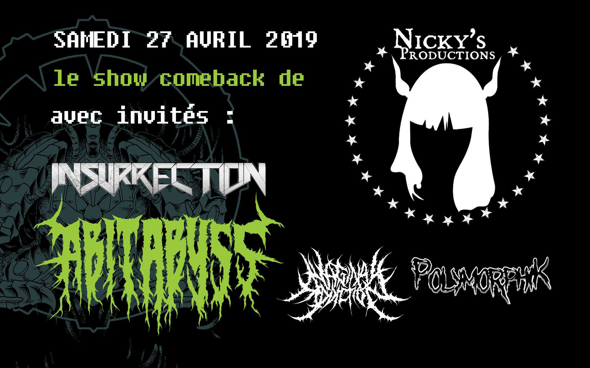 Voici les photos prises par Vicky Fillion lors du spectacle de d’Insurrection présenté par Nicky’s Productions au Piranha Bar de Montréal le 27 avril 2019 et qui mettait également à l’affiche Abitabyss, Vaginal Addiction et Polymorphik.