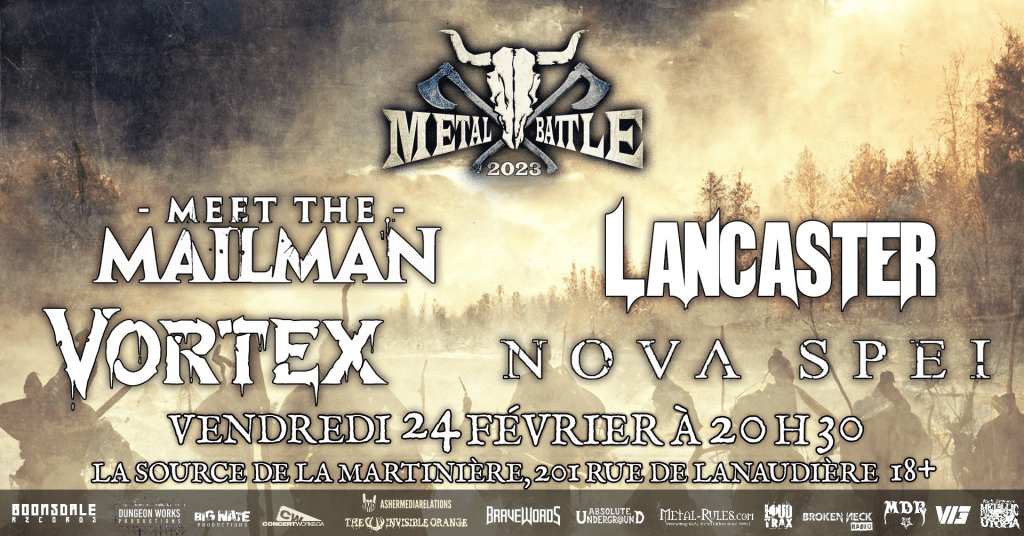 Vendredi, le 24 février 2023, Ondes Chocs était invité pour être l’un des quatre juges sur l’événement mettant en vedette quatre excellentes formations originaires du Québec. En effet, pour cette partie, les formations Lancaster, Nova Spei, Meet The Mailman et Vortex s’affrontaient pour se tailler une place du le Deuxième Round de l’événement qui pourra permettre à un groupe de s’envoler pour le festival Wacken Open Air 2023. Les juges de cette soirée étaient Eric Bed de Prescription Punk Rock CKRL 89,1 FM ; Luc Lainé de CFLX 95,5 Alerte Métallique ; Andrés Martinez de First Wave Studio / Distorsion radio FM et moi-même Daniel Drolet pour le compte de Ondes Chocs.