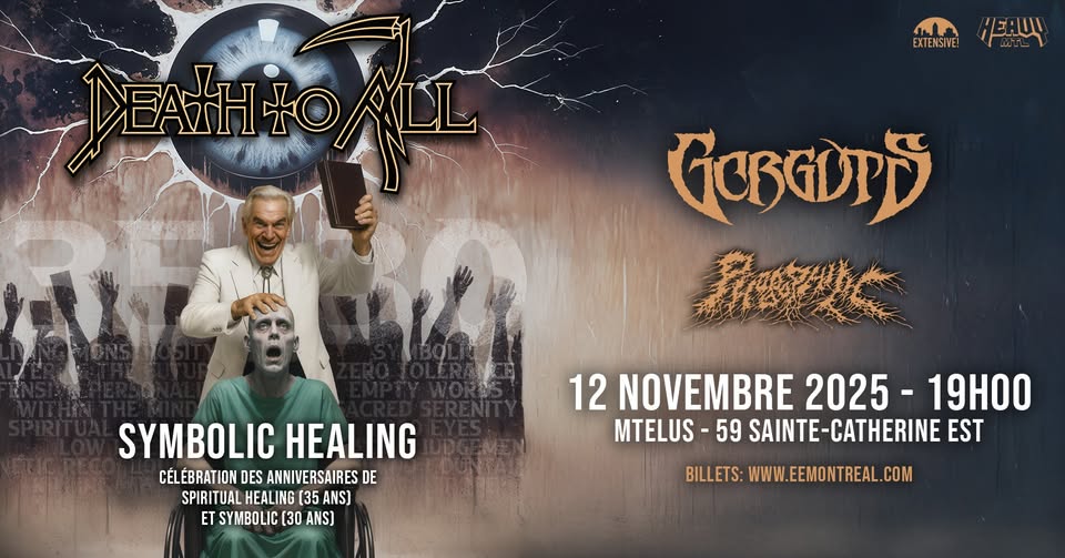 La tournée « Symbolic Healing » du groupe Death to All s’arrêta à Montréal au MTelus afin d’y célébrer le 35ème anniversaire de l’album « Spiritual Healing » et le 30ème anniversaire de « Symbolic », deux albums du défunt groupe Death fondé par la légende du death metal, Chuck Schuldiner. Avec eux, les légendes du death metal québécois Gorguts et les américains de Phobophilic venaient assurés la première partie. Présenté par Extensive Enterprise et Heavy MTL, c’est une soirée de nostalgie qui allait s’emparer du MTelus qui, soit disant, se refait une beauté. Plusieurs travaux ont lieu dans la salle et un mini labyrinthe nous mène au vestiaire. Bref !