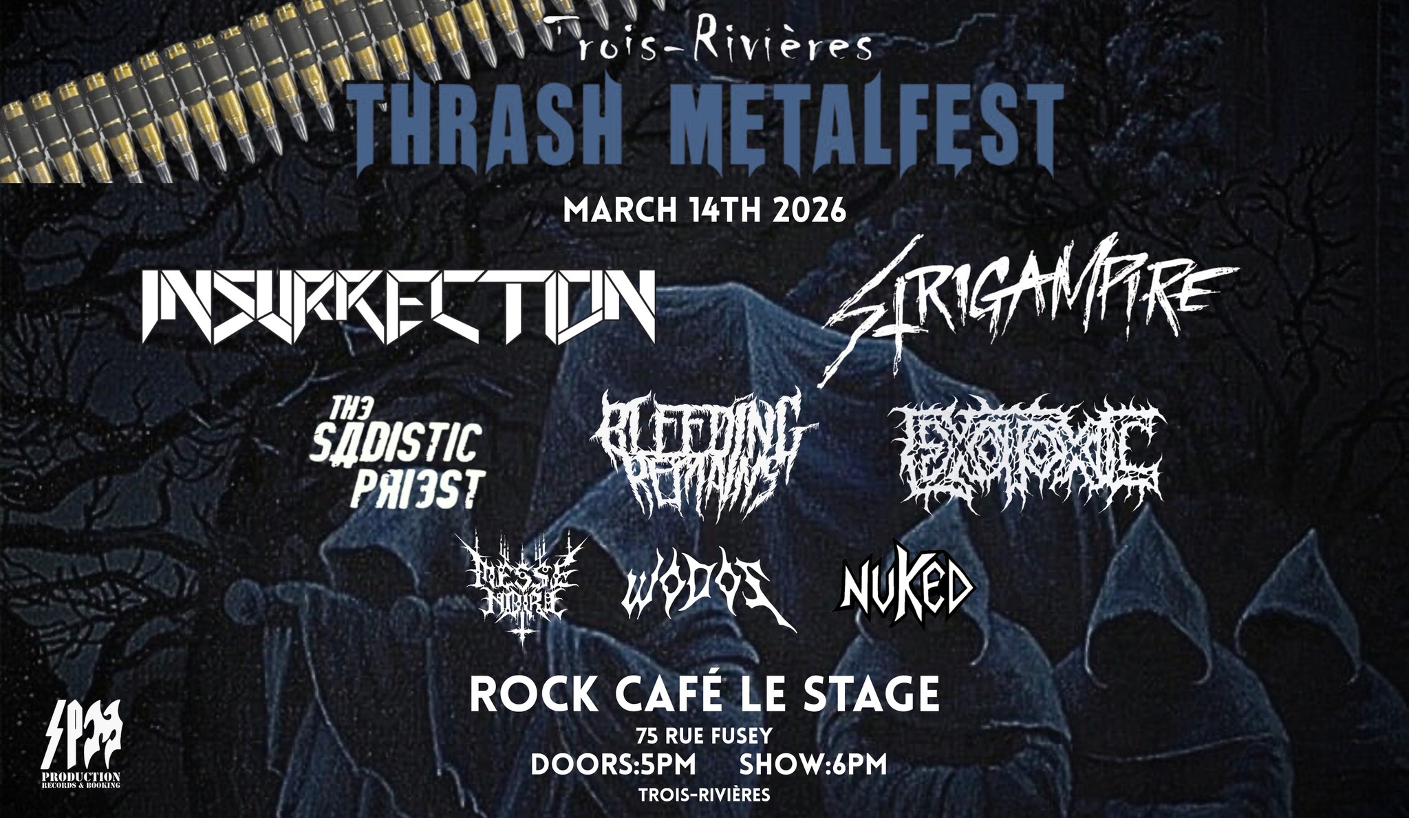 Voici le compte rendu par Christian Lamothe lors du Thrash Metal Fest VI Chapitre 1 présenté par SPM Records & Boooking au Rock Café Le Stage de Trois-Rivières le 14 mars 2026 et qui mettait à l’affiche Insurrection, Strigampire, The Sadistic Priest, Bleeding Remains, Exotoxic, Messe Noire, Wodos et Nuked.