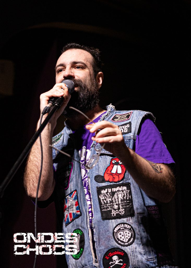 Ils nous arrivent de Québec et entament les hostilités devant un attroupement serré avec nos thrasheurs qui s’en donnent à cœur joie, avec moi qui, une caméra dans la main et le courage dans l’autre, se met au défi d’être bien en avant pour ne rien manquer du spectacle. Un hardcore lourd comme dans la pièce The Only Way avec des pièces a tempo variant comme Agony, voilà qu’on s’en met plein les oreilles tout en sentant le plancher recevoir une symbolique correction face à tant d’énergie devant et sur la scène. Un titre comme Désespoir n’est pas joué sans me rappeler un bon vieux Lofofora comme ambiance. Drop Out Cold, avec leur chanteur Guillaume Chayer, sont un nom à retenir pour tout fan de hardcore…rare que je vais parler de t-shirt et autre »merch », mais voyant ce qu’ils ont fait avec l’image du Nosferatu et Trump sur leur crewneck, wow, beau travail de conception. On termine avec la chanson Human Nature, et finalement, l’acclamation de la prestation n’est pas attendue, clairement et unanimement, toutes les personnes présentes ont adoré la performance. On les découvre à Trois-Rivières et on souhaite les revoir. Ils ont fait fort impression et j’ai très hâte de pouvoir présenter un album ou Ep de ce groupe qui sont dans une belle lancée dans ce monde d’impétueux qu’est la scène Hardcore.