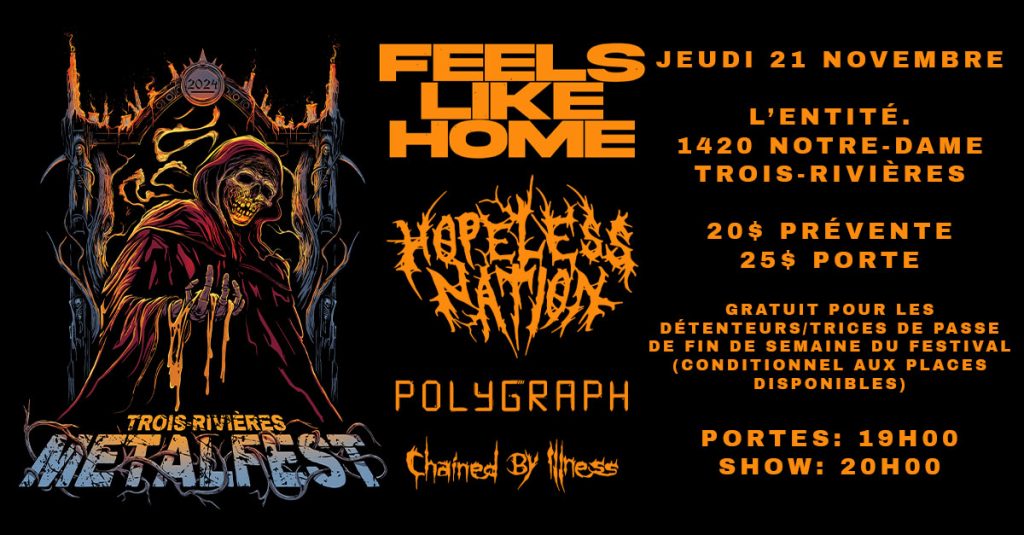 C’est en 2022 que ce groupe trifluvien se forme, mais 2024 est bien l’année où la chenille sort du cocon pour faire sa première envolée avec ses deux premiers titres, soit: Invisible Disease et System Reject. Dès lors, à la première écoute, étonnamment surpris par le son de leurs premières esquisses , je m’assure d’être aux premières loges du premier spectacle du groupe. J’ai le sentiment d’avoir à ma portée un diamant à l’état brut. Marilyn Ayotte m’étonne par son chant qui non seulement est puissant, mais aussi diversifié par de passage doux au growling, par l’utilisation du fry, ses intonations et envolées qui tout à fait étonnantes, sur tout quand on apprend que son apprentissage fut très solitaire à ses débuts. Ses textes roulent dans sa tête, mais pour être entendue, Marilyn ne peut être seule et elle s’entoure de personnes importantes et qui sont déterminantes pour passer à l’étape suivante: devenir Chained by Illness . Jean-Philippe Dessureault, jeune compositeur-guitariste, se joint à elle et sera l’âme de la mélodie du groupe même s’il s’ouvre aux différentes suggestions des autres membres. On va chercher de l’expérience et du tonus en ajoutant Simon Desaulniers à la batterie (aussi membre de Northwalk) et Simon Paquet à la guitare (aussi membre de Darksider). On remplace rapidement le premier bassiste et cofondateur pour ajouter Richard Guilbault à la base, qui fut accepté à l’unanimité, car il était l’homme de la situation. J’ai envie de vous partager, pour ceux qui ne les connaissent pas, la première pièce qui m’a fait connaître ce groupe, voici Invisible Disease.