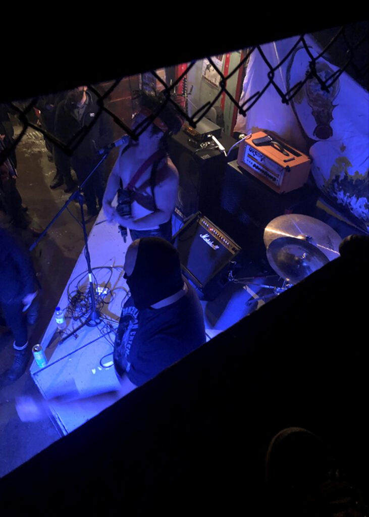 On arrive au point de rendez-vous, en retard (l’histoire de ma vie, mais pas ici), et on voit Mathieu, en bedaine, avec sa perruque et ses pantalons serrés qui vient vers nous. Y’a un autre gars l’autre côté de la rue, qui cherche la place aussi, ben content de nous voir… On suit tous Mathieu, sur le bord de la track, une porte, on entre. Enfin! Le TraXide, j’y suis. Je ne gâcherai pas le mystère et l’underground de la place en le décrivant ici certain, mais c’était parfait, encore mieux que ce que j’avais imaginé. Les gens étaient tous ensemble, tous punks, à l’intérieur ou à l’extérieur et tout ce qu’il y a entre les deux, ou pas… Nous étions tous à la bonne place, dans le moment, et la musique était bonne. Parce qu’il faut pas oublier, j’ai tout écrit ça pour vous parler d’un show…
