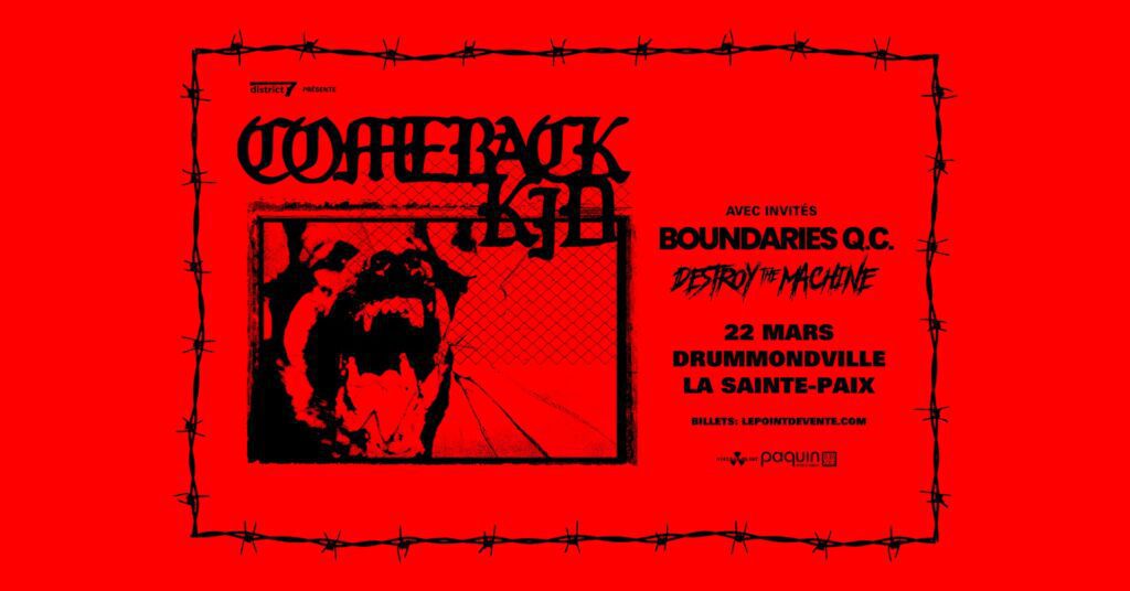 Voici la critique de Dany Marchand lors du spectacle de Comeback Kid présenté par District 7 Production et 123 Punk à la Sainte Paix de Drummondville le 22 mars 2022 et qui mettait également à l’affiche Boundaries et Destroy The Machine.