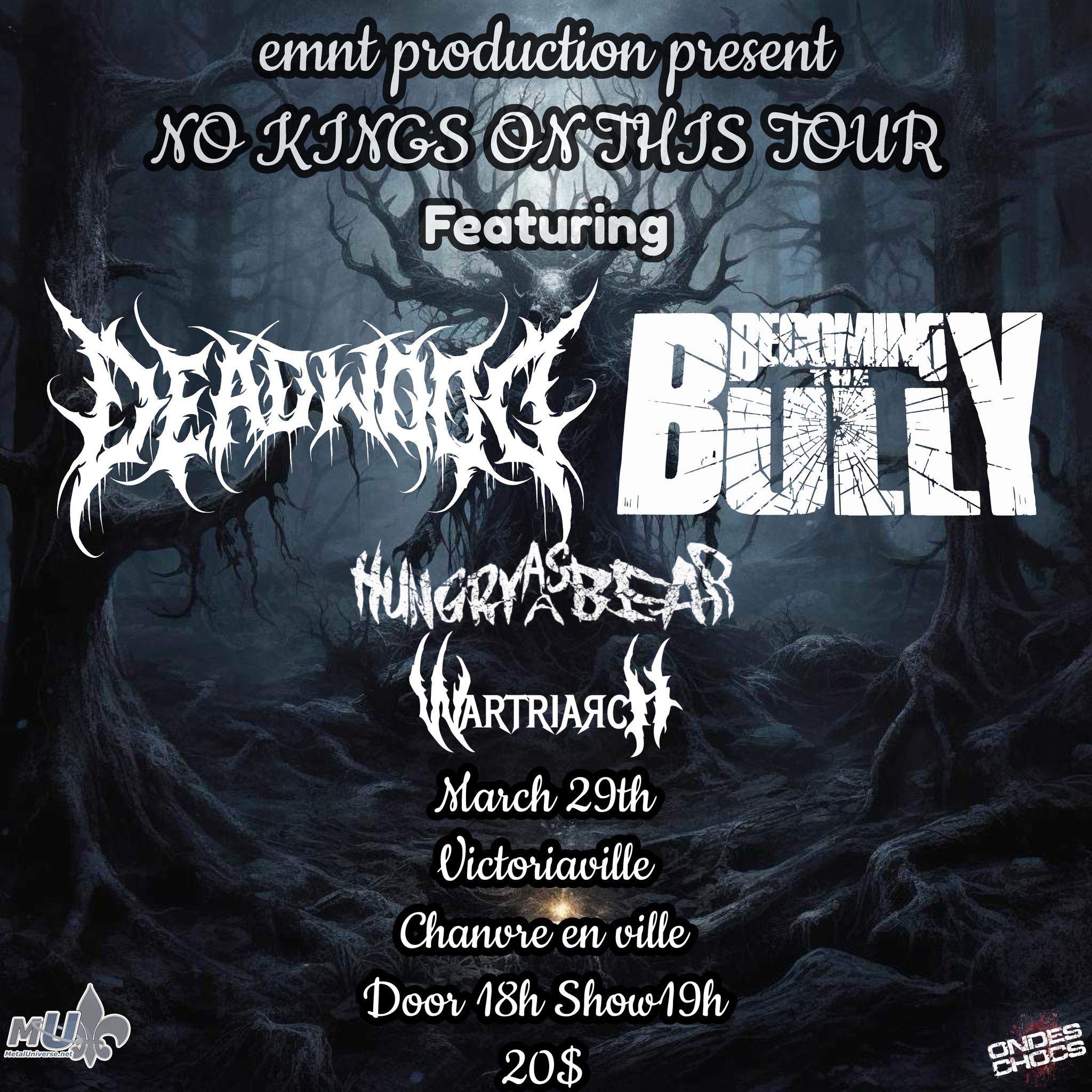 Voici les photos prises par Emilie Hould lors de la tournée No Kings On This Tour présenté par EMNT Production à la salle Le Clandestin de Victoriaville le 29 mars 2024 et qui mettait à l’affiche Deadwood, Becoming The Bully, Hungry As A Bear et Wartriarch.