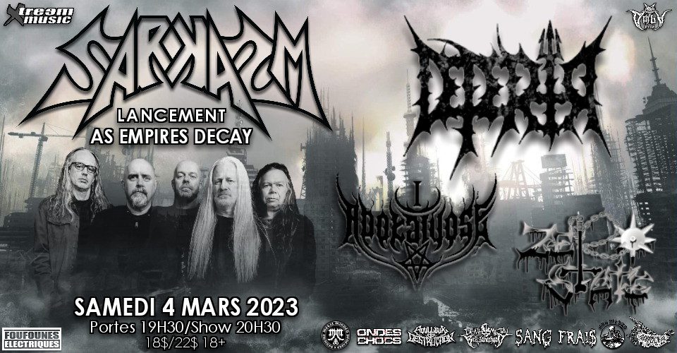 Voici le compte rendu de Daniel Drolet et les photos prises par Martin Desbois lors du spectacle du lancement de As Empires Decay de Sarkasm présenté par DMBH Prod aux Foufounes Électriques de Montréal le 4 mars et qui mettait également à l’affiche Dépérir, Zero State et I, Apokalypse.