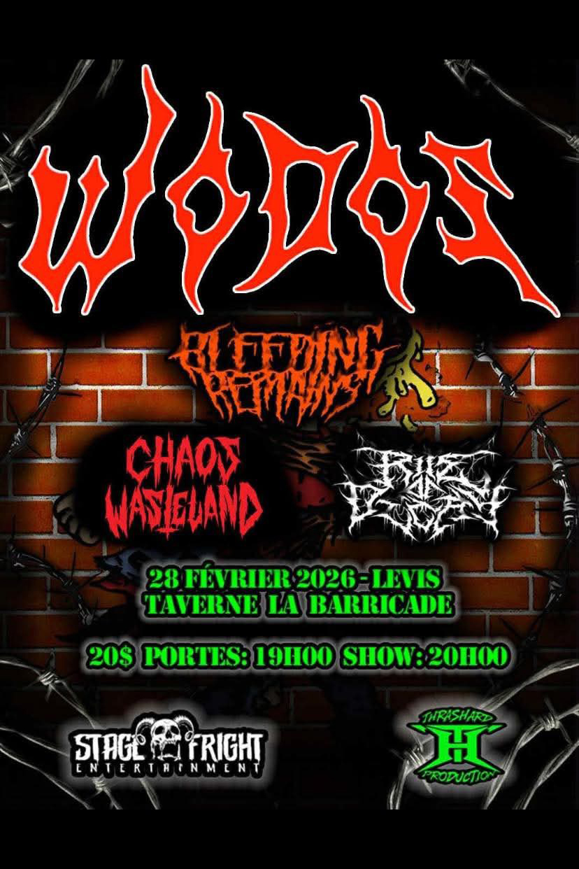 Voici les photos prises par Jimmy St-Pierre Gariépy lors du spectacle de Wodos présenté par Stage Fright Entertainment & Thrashard Production à la Taverne La Barricade de Lévis le 28 février 2026 et qui mettait également à l’affiche Bleeding Remains, Chaos Wasteland et Rite Of Decay.
